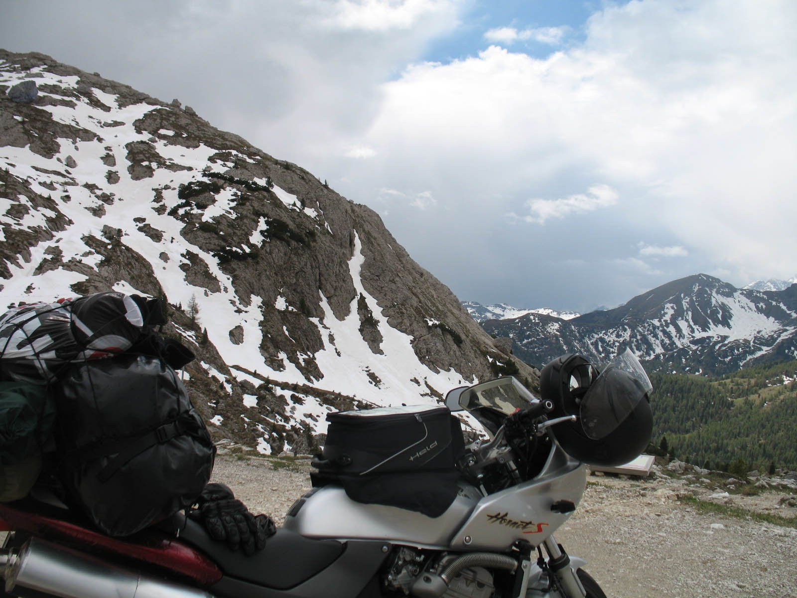 Dieses Mal hatte ich vor, wieder die Alpen zu erkunden und so fuhr ich mit meiner kleinen Hornet vollgepackt bis zum Hals los (Sie macht das erstaunlich gut, Handling war trotzdem hervorragend!). Ich habe ihr ein paar Goodies spendiert, die sie zur vollwertigen Tourenmaschine machten: Hauptständer, Gepäckträger, Hitzefolie am hochgelegten Auspuff und ein paar hübsch hässliche Schutzfolien an der Heckverkleidung... Start am 16. Mai morgens, abends bin ich schon kurz vor Biel/Bienne, in St. Hippolyte an der Doubs, Nähe Lac de Neuchatel, französische Schweiz.